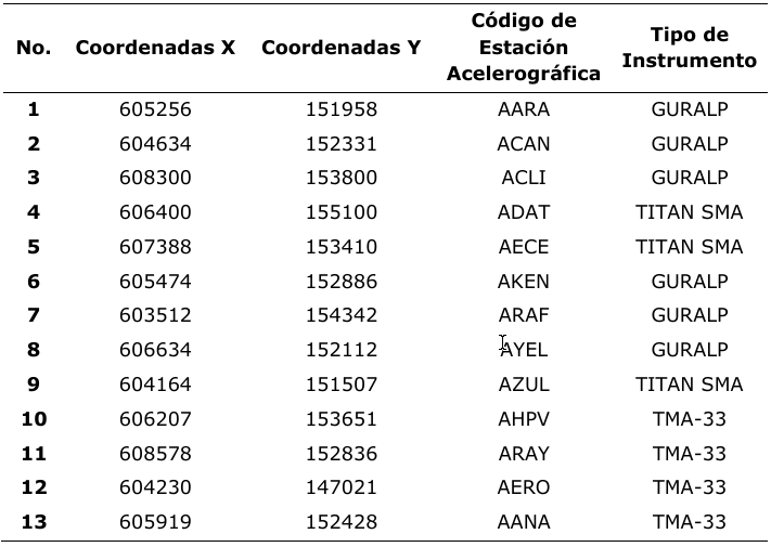 La Tabla 4 muestra los valores de las aceleraciones registradas por 10 de las estaciones acelerográficas, ya que tres de las estaciones de la red no registraron el evento por encontrarse fuera de servicio. Algunos instrumentos han sido desconectados o están rotos, como la estación AREF, razón por la cual esta no aparece en el mapa geológico, ni en el de ubicación geográfica de la red actual.