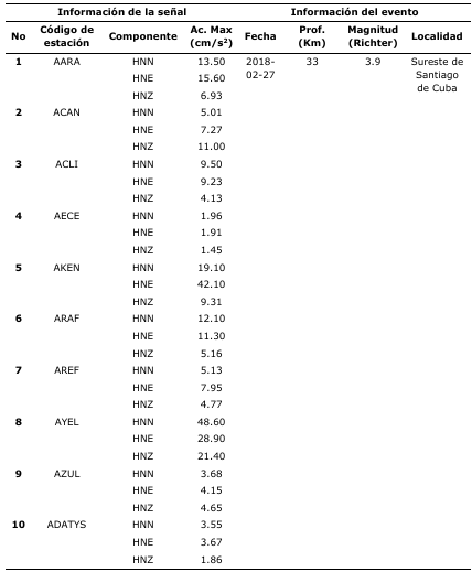 Aceleraciones del terremoto del 27 de febrero de 2018 obtenidas por la red acelerográfica de la ciudad de Santiago de Cuba