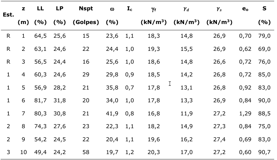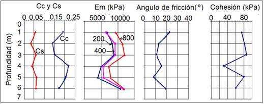 Se parte de la hipótesis que los edificios estudiados están ubicados en un perfil ingeniero geológico, donde se realizaron calas hasta los 10 m profundidad. Las investigaciones experimentales de los parámetros físico-mecánicos en los estratos de suelo encontrados, realizadas por Cabrera (2006) y publicadas por Cabrera y Beira (2007), se resumen en la Tabla 1 y Figura 1. El perfil ingeniero geológico de suelo está formado por una capa de relleno de 3 m, seguido de un estrato arcilloso de alta compresibilidad (CH) hasta 9 m y a la que sigue un estrato de arcilla de baja compresibilidad (CL). El número de golpes promedio por pie (NSPT) hasta los 7 m refieren una consistencia dura, alcanzando ser muy dura por debajo de esta profundidad. Los índices de compresión del suelo (Cc) están entre 0,14 y 0,22 y los de expansión (Cs) entre 0,02 y 0,06. Los cimientos de los edificios modelados se desplantan en el estrato de suelo CH, con una cohesión de 70 kPa, ángulo de fricción interna de 15 grados, peso específico sumergido 9 kN/m3, humedad promedio 30 %, grado de saturación promedio de 80 % y nivel freático a 7 m.