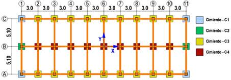 Se analizaron tres variantes de diseño para los platos de cimentación de las 5 tipologías de edificios, considerando en la primera variante el efecto del sismo, en la segunda el efecto del viento y finalmente teniendo en cuenta solo cargas gravitatorias. Las solicitaciones de los cimientos, ofrecidas por el SAP 2000 NL versión 14, fueron exportadas al libro Excel DISCAR 3.0, que realiza el diseño geotécnico y estructural de la cimentación por las normas cubanas vigentes. Las dimensiones de los platos de cimentación, para un valor prefijado de rectangularidad de 1, serán aquellas que garantizan que se cumplan los estados límites de estabilidad al vuelco, deslizamiento y capacidad portante. Para evaluar las consecuencias económicas del uso conservador o no del factor de seguridad adicional establecido en la norma cubana de diseño geotécnico de cimentaciones superficiales (2016) se realizó el proyecto considerando los tres tipos de factores de seguridad adicional (gs) para condiciones geológicas normales, es decir: 1.15, 1.20 y 1.25. Para el diseño estructural se usa acero G-40 (Rak=300 MPa) y hormigón de R’bk=25 MPa, variando el diámetro de barra según la tipología de la estructura para las tres variantes. Se chequeó también el criterio a cortante y punzonamiento. En la Figura 2 aparece la planta de cimentación, así como los tipos de cimientos para el diseño geotécnico y estructural.