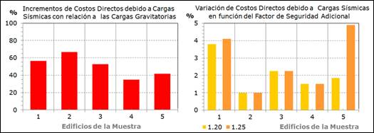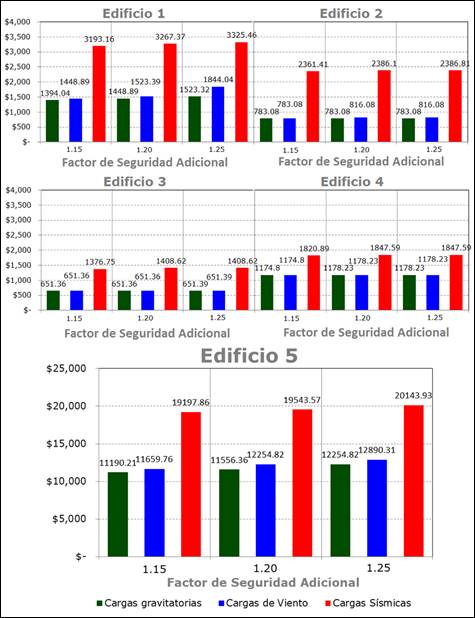 Los resultados de los costos directos totales de cada edificio para cada tipo de carga (vertical, viento y sismo) y factores de seguridad adicional analizados, se muestra en la Figura 3. Es notable la diferencia de costo entre las variantes que consideran o no la acción del sismo, superior en un 34 %, confirmando que en un diseño sismo-resistente habrá un mayor consumo de materiales (hormigón y acero). No hay diferencias significativas de los costos bajo el efecto de las cargas gravitatorias y del viento (Tabla 5).
