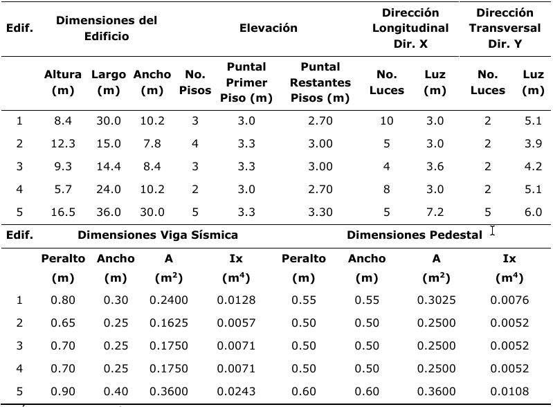 Se estudian cinco edificios de baja altura, 4 de viviendas y uno social, con diferentes plantas y puntal (Tabla 2), a construir en la ciudad de Santiago de Cuba en perfil de suelo D, según la norma sísmica cubana NC 46:2017 (2017), de acuerdo con las características físico-mecánicas del estrato resistente. Para los edificios de vivienda, la profundidad de desplante es de 2.30 m, partiendo de la ejecución de una terracería que termina en la profundidad - 0.70 m de la superficie del terreno, ejecutada hipotéticamente por razones constructivas antes de la ejecución de la obra. En el caso del Edificio 5 para servicio social la profundidad de desplante será considerada a 3 m de profundidad desde la cota de terreno natural. La modelación de las estructuras se realizó con el SAP 2000 NL versión 14. Las combinaciones de cargas utilizadas para el diseño de la cimentación se corresponden con las recomendadas por la NC 450:2006 (2006) para las cargas de viento y gravitatorias y por la NC 46:2017 (2017) para las cargas sísmicas.
