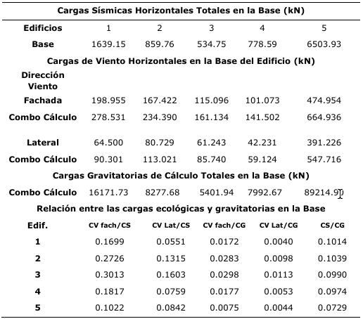 Las cargas sísmicas horizontales totales, cargas de viento para las dos direcciones de actuación del viento y cargas gravitatorias totales en la base de suelo se resumen en la Tabla 3.