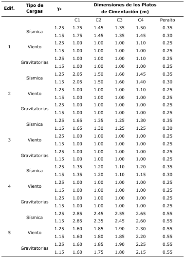 Las dimensiones (L = B) del plato de cada uno de los cimientos tipos de los edificios para cada variante y factor de seguridad adicional considerado, se resumen en la Tabla 4. Se aprecian incrementos considerables (por encima del 30 %) de estas dimensiones cuando incide la carga sísmica, resultados que repercuten en el análisis económico. Las dimensiones de los platos de los cimientos requieren de mayores dimensiones independientemente del tipo de edificio cuando se incluye la carga sísmica en las combinaciones de carga y variando poco en función del factor de seguridad adicional.