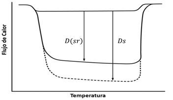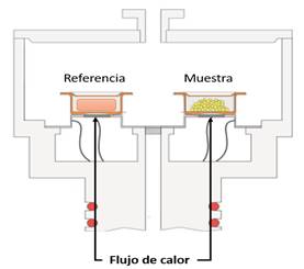 El DSC se realiza a partir del análisis de dos muestras de masa conocida colocadas en pequeñas cápsulas, las cuales se calientan o se enfrían y los cambios en su capacidad calórica se siguen como cambios en el flujo de calor. Los datos se obtienen como entradas diferenciales de calor en función de la temperatura (Clas et al. 1999; Sandoval et al. 2005) según lo mostrado en la Figura 2.