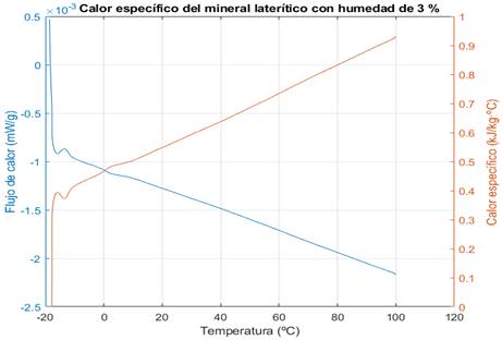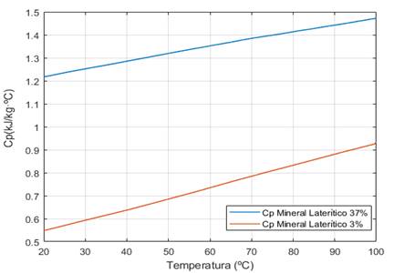 Mediante la calorimetría diferencial de barrido se determinó que el calor específico del mineral laterítico húmedo varían entre 1,249 kJ/kg·ºC y 1,46 kJ/kg·ºC para los rangos de temperatura de 20 ºC a 100 ºC mientras que para el mineral laterítico seco los valores están entre 0,5559 kJ/kg·ºC y 0,902 kJ/kg·ºC para los mismos valores de temperatura.