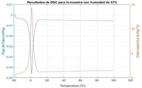 De la Figura 6 se deduce que en el mineral laterítico con humedad de 37 % ocurre un proceso de congelación entre los valores de temperatura de -10 ºC a 10 ºC. Este proceso provoca la absorción acelerada de calor y por consiguiente el incremento del calor específico en este intervalo, dando lugar a la formación de los picos negativo en el flujo de calor y positivo en el calor específico. Se observa además que a partir de 10ºC se muestra un incremento paulatino del calor específico en correspondencia con el aumento de la temperatura.