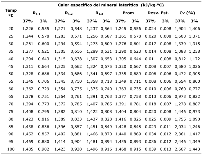 Para la determinación del calor específico del mineral laterítico se realizaron dos experimentos, uno para el mineral laterítico con una concentración de humedad en base a la masa seca de 3 % y otro para una concentración de 37 %. En cada uno de los experimentos se le hicieron tres réplicas y se determinó el promedio entre las tres.