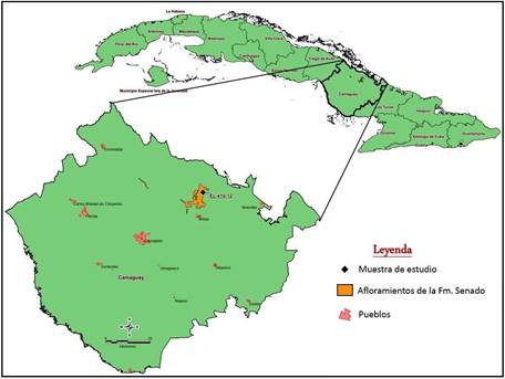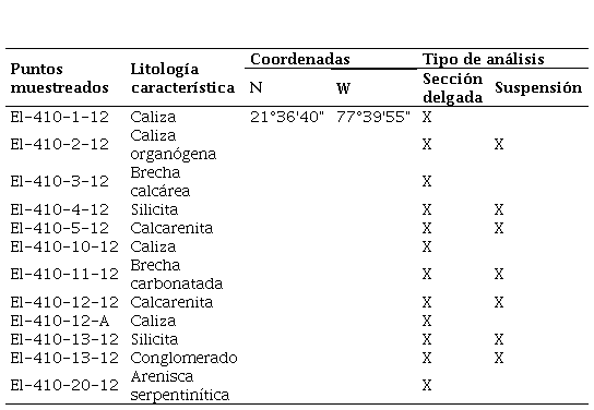 Fueron analizadas 12 muestras del área de Cairije (EL, colectadas por el geólogo Evelio Linares en el año 2012) correspondientes a la Formación Senado (Tabla 1, Figura 1). Todas se examinaron mediante el método de sección delgada, y siete por suspensión.