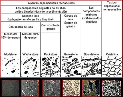 El método seguido para el estudio petrográfico fue la observación visual bajo el microscopio óptico y biológico. Para realizar las descripciones petrográficas de las rocas carbonatadas se tuvo en cuenta la clasificación de Dunham (1962), modificada y ampliada por Embry & Klovan (1971) (Figura 2).