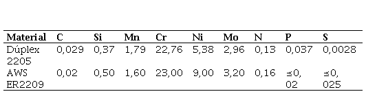 La Tabla 1 expone la composición del acero inoxidable dúplex 2205, determinada por análisis espectral de emisión óptica. También muestra la composición química del alambre AWS ER2209, empleado como consumible.
