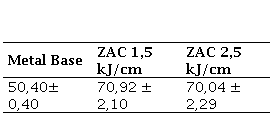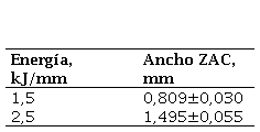Para ambos valores de energía (1,5 kJ/mm y 2,5 kJ/mm), la macrografía de la ZAC muestra una inflexión en la línea de fusión, como se evidencia, a modo de ejemplo la de la energía 1,5 kJ/mm, en la Figura 1. Este aspecto de la zona fundida de la soldadura se reportó en la soldadura especializada para mezclas de gas de protección Ar–CO2 (Scotti y Ponomariev 2008). Esto conduce a que, en la zona de la inflexión de la línea de fusión, sea donde la ZAC se hace más ancha (Figura 2). La Tabla 2 muestra los valores de ancho de la ZAC, evidenciándose que ocurre un crecimiento con el aumento de la energía de entrada.