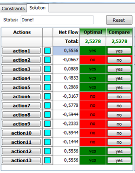 La Figura 9 exhibe el resultado del análisis de las 13 acciones y todos los escenarios resultando seis acciones las de mejores posiciones en cuanto a su jerarquía (Rank) marcadas por valores resultantes de Phi positivos. También pudo diferenciarse las seis mejores acciones a partir del análisis de las soluciones óptimas (Figura 10). La representación gráfica (Figura 11). muestra el posicionamiento de las seis mejores acciones.