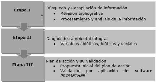 La Figura 2 expone la secuencia investigativa, estructurada en tres etapas. En la etapa I se revisaron y procesaron diferentes fuentes y bases de datos del Ministerio de Ciencia Tecnología y Medio Ambiente (CITMA), del Instituto Nacional de Recursos Hidráulicos (INRH), de la Dirección Provincial de Planificación Física (DPPF), de la Delegación Provincial del Ministerio de la Agricultura (MINAGRI) y de la Oficina Nacional de Estadísticas (ONE).