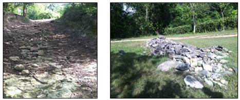 La presencia de insuficientes barreras físicas para contrarrestar la erosión (Figura 6) fue otro aspecto detectado de gran trascendencia. En uno de los extremos del puente se construyeron barreras físicas, y se vertieron rocas directamente encima del puente para evitar la erosión que provoca la escorrentía de las aguas al pasar por encima de este. Cabe destacar que estas acciones han sido obra e iniciativa de los trabajadores y pioneros del campamento que se encuentra en las proximidades, quienes sin conocimiento suficiente han llevado a cabo esta labor y, por tanto, no ha sido del todo efectiva.