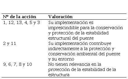 El análisis a través del software PROMETHEE permitió definir seis acciones óptimas que garantizarán la protección de la estabilidad del puente. Se definieron además dos acciones que están dentro de los límites permisibles con valores resultantes de Phi negativos (de 0 a-0,15) que clasifican como acciones que contribuyen indirectamente a la protección y conservación ambiental del puente y su entorno; también se definieron cinco acciones que no tienen relevancia directamente en la protección del puente, aunque su incidencia se evidencia en el cuidado y protección del entorno (Tabla 1).