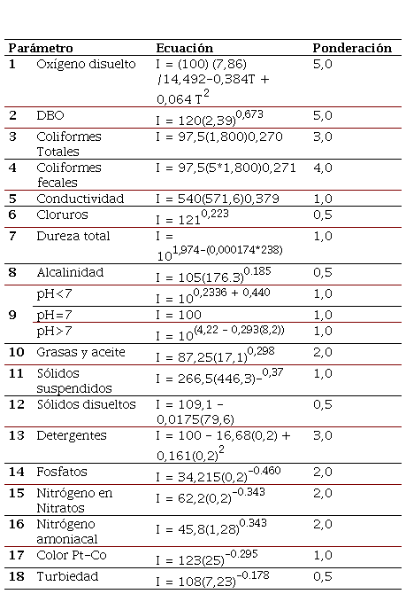 Donde: ICA = índice de Calidad del Agua, 0 = < I = < 100, Ii = Función subíndice del parámetro i, 0 = < I = < 100, Wi = Peso de importancia del parámetro (factor de ponderación) i, 0 = < Wi =< 5, n = Número de variables empleadas.