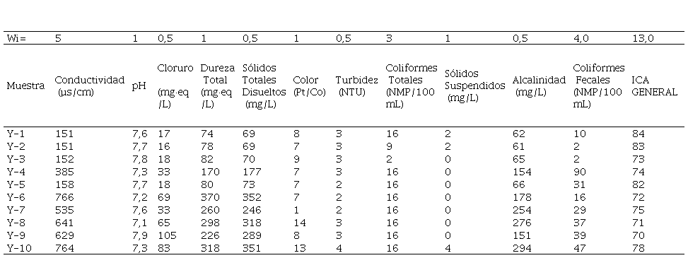 En la Tabla 3 se exponen los resultados de los ICA de cada variable, con sus respectivos pesos de importancia y el ICA general de las aguas de consumo de Yamanigüey.