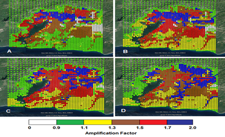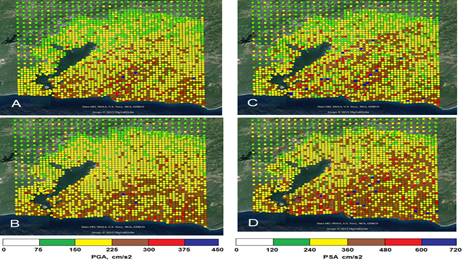 La Figura 8 muestra el escenario del mapa de sacudidas para la ciudad de Santiago de Cuba utilizando los espectros de amplificación del sitio para ambos escenarios de terremotos fuertes. Téngase en cuenta que en el punto definido como centro de Santiago se obtiene un factor de amplificación de aproximadamente 2 (Tabla 9). La mayoría de los valores de PGA (Figura 8A,8B) en el centro de la ciudad están entre 150 cm/s. y 300 cm/s. y los valores en algunos puntos aumentan hasta 400 cm/s.. Los valores de PSA a 3,3 Hz o período de 0,3 segundos (Figura 8C,8D) superan los 480 cm/s. en varios puntos de la ciudad para ambos escenarios de terremotos, lo que tiene un efecto significativo en los edificios de baja a mediana altura de la ciudad.