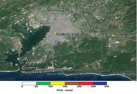 · El mapa de sacudidas para la ciudad de Santiago de Cuba muestra grandes valores de aceleración del terreno en varios puntos de la ciudad cuando se considera la respuesta espectral del suelo, particularmente en el casco histórico, una de las zonas más vulnerables, donde el PGA podrá alcanzar valores de 375 cm/s. para ambos escenarios de terremotos. El PSA a 3.3 Hz podrá afectar a edificios de baja y media altura con valores superiores a 480 cm/s..