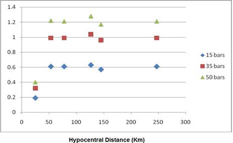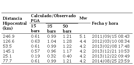 Los resultados para diferentes valores de caída de esfuerzos usados en la validación se muestran en la Tabla 3 y Figura 2. Es evidente que la modelación con 15 bars subestima los datos observados y la de 50 bars los sobrestima. Note en la Figura 2 que el radio entre el PGA modelado y observado para diferentes distancias debe de estar cerca de 1 para que tengan valores parecidos. En este caso la caída de esfuerzo de 35 bars tiene cocientes cercanos a 1 para casi todas las distancias con excepción del evento más cercano que se encuentra a 25 km aproximadamente de la estación de Rio Carpintero. A esta corta distancia cualquier variación en la profundidad del foco podría variar abruptamente los valores calculados de PGA, por lo que esta incongruencia podría estar asociada a errores de localización del evento.
