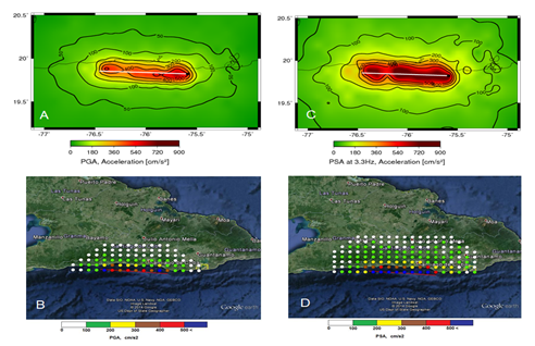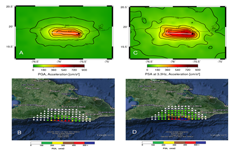 Dado que la mayor parte del entorno construido en las ciudades de Cuba oriental son casas y edificios de baja altura, el potencial de daño de los terremotos está controlado en gran medida por la sacudida del terreno a frecuencias mayores a 3.3 Hz o periodos menores a 0.3 segundos. Por lo tanto, se presentó también la distribución de sacudidas del terreno para la aceleración espectral máxima (PSA) a una frecuencia de 3.3 Hz (Figura 3C, 3D). Se encontró que las aceleraciones espectrales en suelo rocoso superan los 200 cm/s. en una gran área del sur de Cuba, incluidas partes de la ciudad de Santiago de Cuba.
