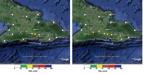 La Figura 3 (A,B) muestra la aceleración pico (PGA) del movimiento simulado del lecho rocoso debido a un terremoto de magnitud Mw = 7.0 con caída de esfuerzos de 35 bars. Debido a la ubicación de la ruptura, el valor de aceleración más fuerte ocurre en alta mar. Sin embargo, se espera una sacudida del terreno que excede los 100 cm/s. en una gran área del sur de Cuba oriental, principalmente la ciudad de Santiago de Cuba, lo cual puede afectar seriamente las construcciones vulnerables.