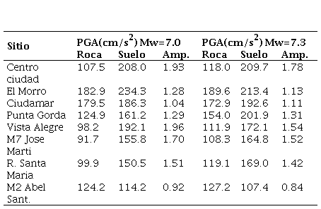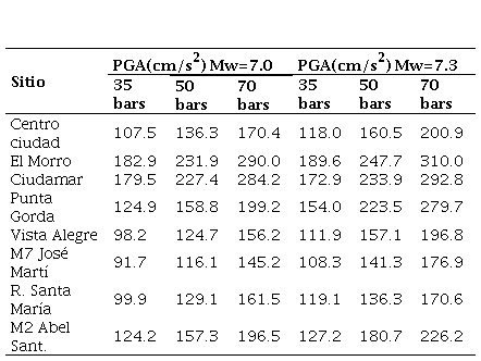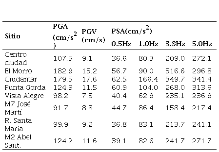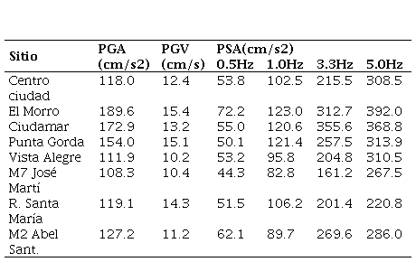 Además, se muestran los valores del movimiento del terreno en roca de varios puntos de la ciudad de Santiago de Cuba para el escenario M7.3 (Tabla 8).
