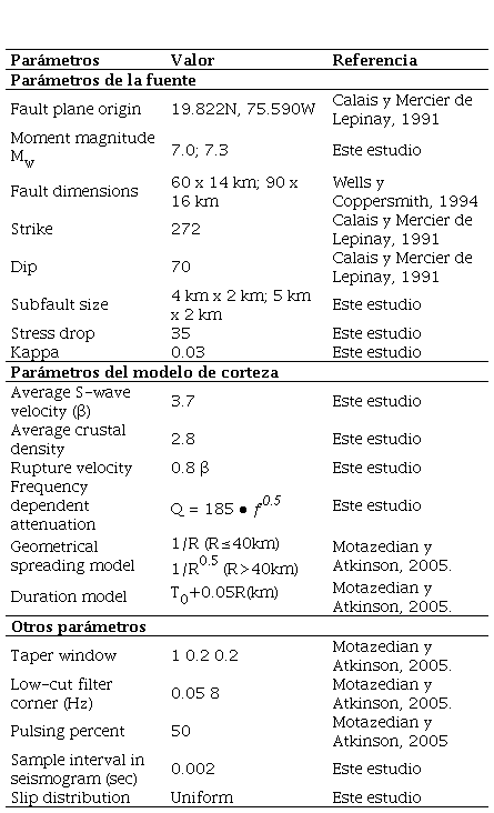 La modelación fue realizada con el programa EXSIM (Motazedian y Atkinson 2005; Boore 2009) con parámetros de entrada tomados de las referencias o calculados con un análisis de los registros de terremotos locales (Tabla 1). Primero se calculó el movimiento del terreno en roca para una malla regular de puntos que cubrían gran parte de la zona oriental de Cuba y luego se aplicó el espectro de amplificación del suelo en varios puntos de la ciudad de Santiago de Cuba (Rivera et al. 2015).