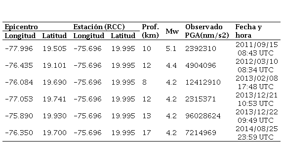 Para obtener la caída de esfuerzos se procesaron los espectros de la fuente (Havskov y Ottemoller 2008) de cientos de terremotos locales obteniéndose un promedio de 35 bars. Para comprobar si este valor era adecuado para el área se modeló la aceleración pico (PGA) de seis terremotos de magnitudes mayores a 4 (Tabla 2) y se comparó con la observación real. La estación seleccionada fue Rio Carpintero por ser la más cercana a la ciudad de Santiago de Cuba. El valor de PGA observado es el resultado del promedio de las dos componentes horizontales.