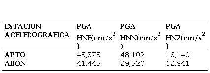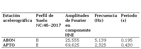 La estación APTO ubicada sobre suelo blando muestra los mayores valores de amplitud (69,625), así como los mayores valores de periodo (0,430 s) en comparación con la estación ABON (0,195 s). El mayor periodo (0,430 s) se refleja sobre los depósitos marinos, arenas y guijarros de playa y bancos de tormenta de la estación APTO. El máximo valor de frecuencia (5,139 Hz) corresponde a la estación ABON (Tabla 2).