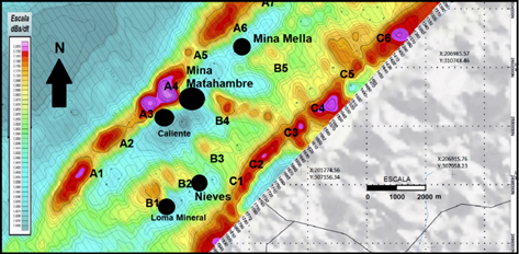 con potencialidad minera, de las cuales solo dos corresponden al distrito Matahambre-Mella –anomalías B2 y A7- coincidiendo la primera con el conocido prospecto Nieves (Figura 1).