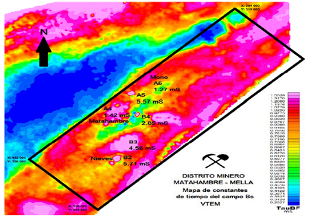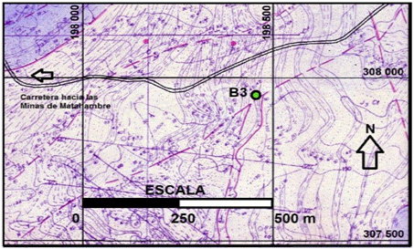 En el año 2021 se realizó una re-interpretación del VTEMPlus en el área del distrito Matahambre-Mella (Carballo-Otero 2021). Un resultado imprevisto fue detectar la potencialidad minera de una tercera anomalía –la B3– que no coincide con mineralizaciones conocidas y que con una constante de tiempo de 4,56 ms parece indicar un depósito de sulfuros (Figura 2). El objetivo del presente trabajo fue examinar en detalle la anomalía B3 como indicador de un posible nuevo depósito de plomo y zinc.