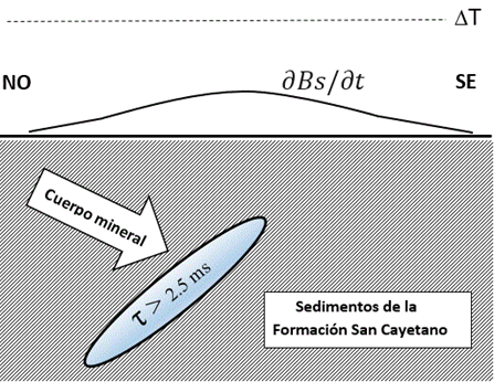 · Se recomienda realizar una exploración terrestre in situ para comprobar la naturaleza mineral de esta anomalía, precisar sus contornos y evaluar su potencialidad minera, pero especialmente los autores proponen examinar el área aledaña al SE de su epicentro, por el posible desplazamiento de la anomalía VTEM con respecto al hipotético depósito, producto de la canalización de las corrientes inducidas por el electromagnetismo, como se observa en otros depósitos ya conocidos.