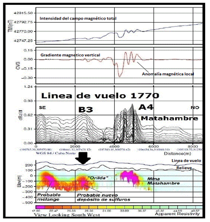 B3 presenta un bajo perfil (Figura 4), lo cual coincide con el modelo de pronóstico VTEM, que muestra a un objeto electroconductor relativamente profundo y sin anomalía magnética ∆T.