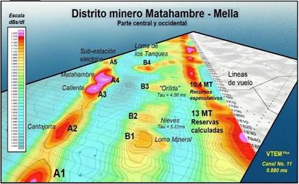 En el año 2009 se realizó un informe de generalización de los métodos electromagnéticos empleados en el NO de la provincia de Pinar del Río (Carballo-Otero y Moya 2009, 2015), cuya principal recomendación fue realizar un levantamiento aeroelectromagnético en el dominio del tiempo (TEM) para todo el territorio, lo cual se materializó parcialmente en el año 2013, cuando la empresa minera EMINCAR S.A. contrata a la compañía geofísica canadiense GEOTECH Ltd., para sobrevolar 960 km. de la parte centro-oriental de a las Alturas de Pizarras del Norte (que incluye al distrito minero Matahambre-Mella), con su sistema electromagnético helitransportado del dominio del tiempo VTEMPlus, simultáneamente acompañado con un levantamiento aero-magnético de gradiente horizontal.