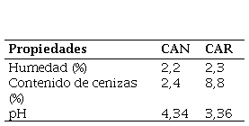 Se evaluaron dos tipos de CA; el primero, un CA granular virgen Norit empleado en el proceso de producción de ron (CAN), y el segundo, ese mismo carbón, pero ya regenerado luego de ser declarado agotado en el proceso de filtración del aguardiente (CAR). Los datos de su caracterización se muestran en la Tabla 1.