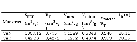 La caracterización textural por adsorción de N2 de los carbones empleados evidencia que son microporosos, con un mayor volumen de microporos que de mesoporos.