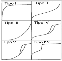 El estudio de adsorción puede realizarse mediante la identificación de la forma y la curvatura de las isotermas de adsorción y mediante su modelo matemático (Azizian 2004; Garrido et al. 2019). La forma de las isotermas depende en gran medida del tipo de adsorbente y el adsorbato, por tanto, las mismas serán diferentes como se indica en la Figura 1, según la clasificación de la IUPAC.
