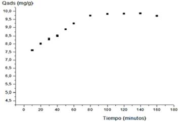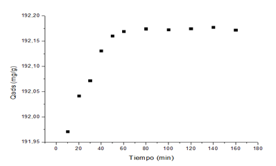 El estudio cinético permitió comprobar que la remoción del Cu(II) y Ni(II), muestra inicialmente un incremento paulatino de la masa de iones metálicos adsorbidos, hasta alcanzar valores constantes que representan el estado de equilibrio o de saturación de la superficie del material adsorbente. En las Figuras 2 y 3 se comprueba que para el Cu(II) el equilibrio se establece a los 80 min, mientras que para el Ni(II) es a partir de 60 min; en ambos casos el tiempo óptimo, según las condiciones experimentales, para lograr la máxima remoción de Cu(II) y Ni(II).