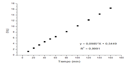 Al analizar los resultados experimentales se demostró que la cinética del proceso de adsorción de los iones Cu(II) y Ni(II) es descrito por el modelo de pseudo-segundo orden, como se muestra en las Figuras 4 y 5.