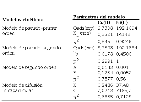 - El estudio cinético del proceso de adsorción de los iones Cu(II) y Ni(II) demuestra que se alcanza el estado de equilibrio a los 80 min y 60 min, respectivamente. El modelo cinético de pseudo-segundo orden describe el proceso de adsorción para ambas especies metálicas.