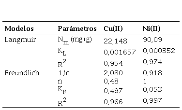 Los máximos valores de adsorción para los iones Cu(II) y Ni(II) en el equilibrio son de 22,148 mg/g y 90,09 mg/g respectivamente, resultando elevados al ser comparados con los reportados en la literatura para la remoción de los iones Cu(II), Ni(II) y otros iones metálicos empleando diversos materiales adsorbentes (Basso y Cukierman 2001; Tejeda y Herrera 2014; Tapia 2017, 2018; Garrido et al. 2019; Pabón et al. 2020; Góngora y Sosa 2022). En el caso del Cu(II), este resultado es inferior a la bentonita sódica y al carbón activado, superior al caolín y la bentonita cálcica y similar al resto de los adsorbentes.
