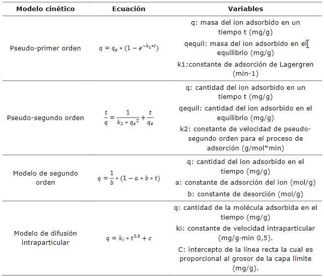 Se considera que la velocidad del proceso está controlada por las etapas 2 y 3, difusión externa y la difusión intraparticular, respectivamente. En el estudio cinético se analizaron los modelos siguientes que describen la velocidad del proceso (Tabla 2):