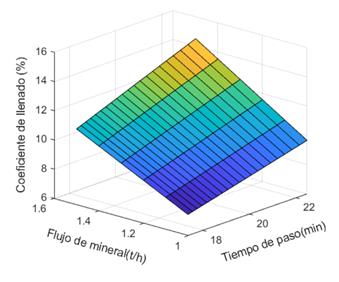 La relación entre el coeficiente de llenado y el tiempo de paso con el flujo de mena se muestra en la Figura 3 Para los flujos de mineral entre 1 t/h y 1,5 t/h y tiempos de retención entre 15 min y 22 min se obtienen valores del coeficiente de llenado entre 8 % y 16 %.