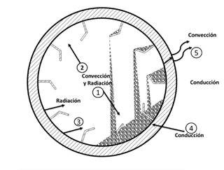 Una parte del calor absorbido por la pared es transferido por radiación a la superficie del sólido con la que no está en contacto (3) y, por conducción, a la superficie del sólido que está en contacto con la pared (4) (Froment y Bischoff 1990). Además, se considera la presencia de la radiación y la convección de manera simultánea debido las cavidades presentes en los sólidos porosos en los cuales se acumulan gases. Esta última condición de transferencia de calor es parte del ciclo regenerativo de la pared del cilindro al sólido (Agustini 2006).