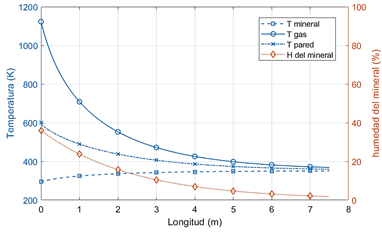 Se debe resaltar que en los primeros metros es donde el gas experimenta mayor descenso de temperatura resultado de la mezcla de este con el flujo de mena que entra al secador a temperatura ambiente (entre 295 K y 301 K) y concentraciones de humedad entre 30 % y 38 %. En cambio, la temperatura de la mena va incrementándose gradualmente en los primeros metros hasta valores cercanos a los 368 K para luego permanecer casi constante alcanzando un equilibrio térmico entre la temperatura del gas y de la pared.