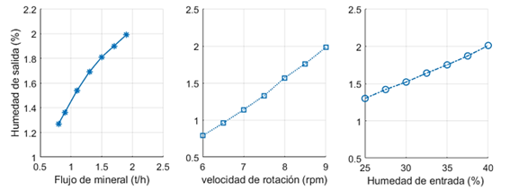 Como se muestra en la Figura 5 existe un comportamiento lineal entre la humedad de salida de la mena con la velocidad de rotación del secador y la humedad de entrada. Mientras que la relación entre la humedad de salida y el flujo de mena muestra un comportamiento logarítmico, siendo la velocidad de rotación la variable que mayor efecto ejerce sobre la humedad de la mena a la salida.