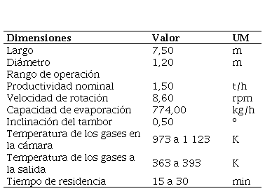 El tambor rotatorio posee un sistema motriz acoplado al cuerpo que le permite rotar alrededor de su eje apoyado sobre rodillos. En la pared interior tiene aditamentos soldados, llamados levantadores, diseñados para garantizar una cortina de mena (sólido) por el efecto de la rotación del tambor y la gravedad. Las características técnicas y constructivas del secador analizado se muestran en la Tabla 1.