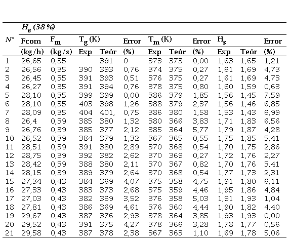 La Tabla 2 resume los resultados experimentales, se exponen los valores de temperatura del gas, de la mena y la humedad de la mena a la salida del secador en función del flujo de mena y de combustible alimentado. Además, se relacionan los valores de las variables obtenidas de forma experimental y los valores teóricos calculados con el modelo matemático para iguales condiciones. En esta se comprueba que los errores relativos puntuales para la humedad de la mena varían entre 0 % y 10 %. Vale destacar que, de los errores calculados, el 69 % son inferiores al 6 %. Por otro lado, se determinó que error relativo promedio es de un 3,9 %.